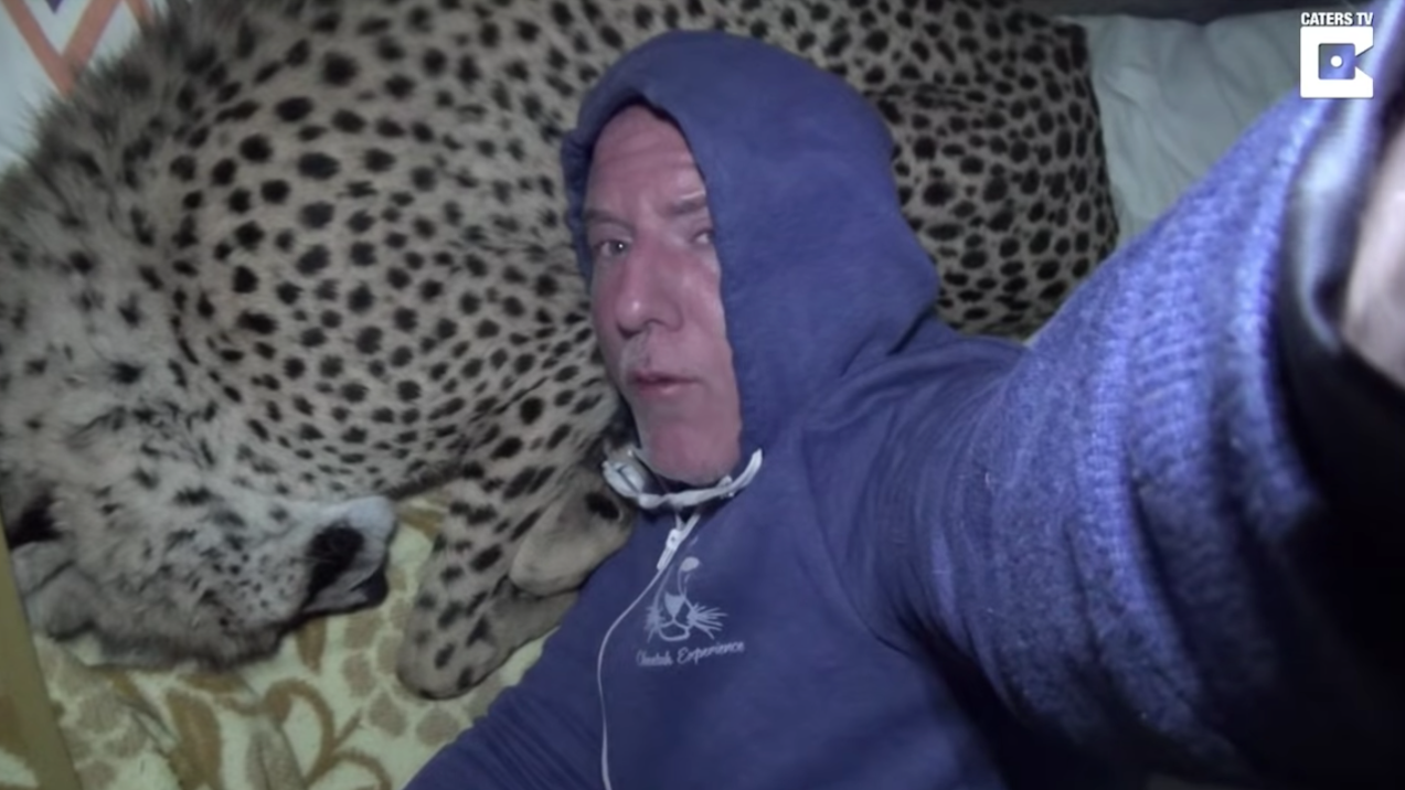 很多人都試過抱著家裡的毛孩入眠,但是抱著「大貓」你又有試過嗎?下面這位美國動物行為學家Dolph Volker就透過隱藏攝影機拍到超驚人一幕,當他睡著的時候,半夜突然有一隻獵豹闖進帳篷裡!